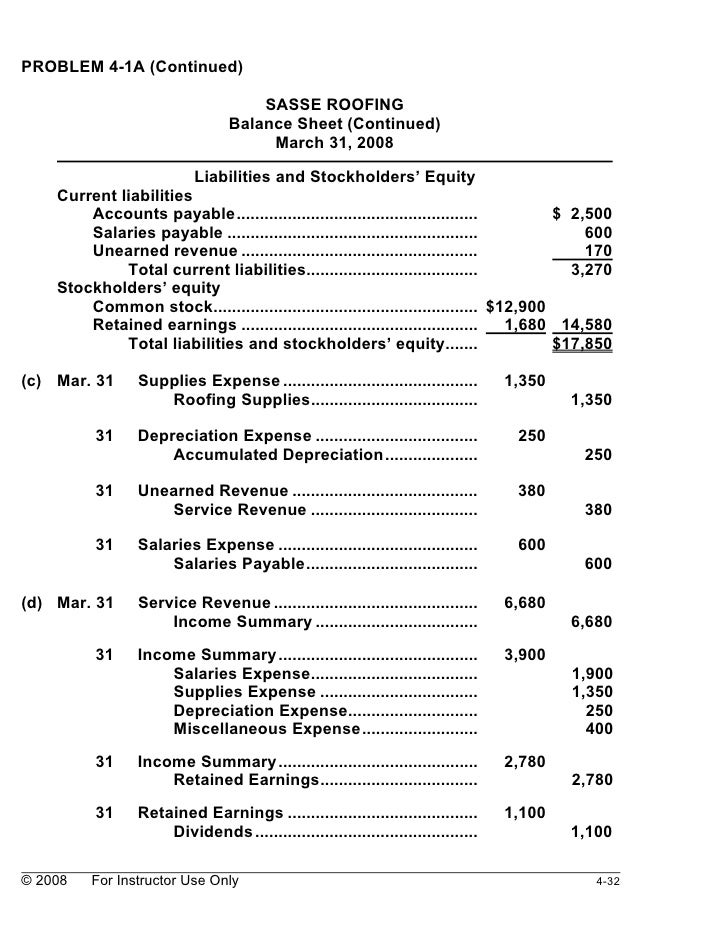 PROBLEM 4-1A Continued LAMPERT ROOFING Balance Sheet Continued March 31 2014 Liabilities and Owners Equity. Cash 4500 Accounts Receivable 3200 Supplies 2000 Equipment 11000 Accumulated Depreciation Equipment 1250 Accounts Payable 2500 Unearned. Stock at 31 st December was valued at Rs.